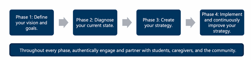 Start by assessing your current state. Where is your system in relation to your goals? Where are your strengths? What do you already have in place? Where do you need to focus? Who is experiencing success and who is not? Ask educators, leaders, students, and families for input, walk through classrooms to understand what is happening in instruction now, and review current data, materials, lessons, and resources in use to gain a clear picture of where your system stands.