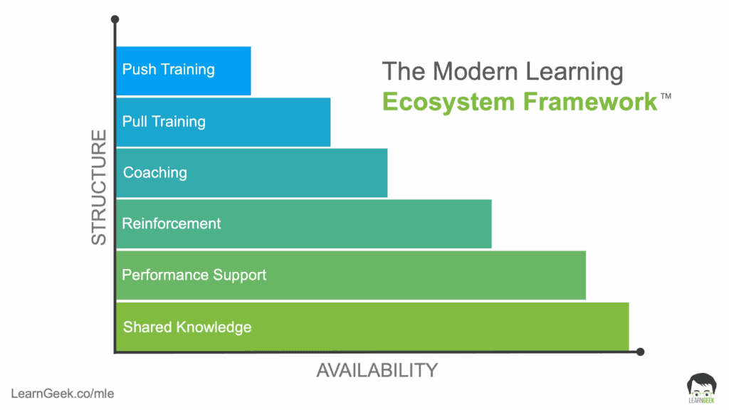 The Modern Learning Ecosystem (MLE) Framework, illustrated in the image, provides a model for the type of layered professional support that effectively fosters lasting change. The model emphasizes the importance of offering layered support through a range of structures, from formal to informal, and with varying availability, from time-bound to on-demand. This model can help systems think about what effective professional learning support for educators will need to include, from one-time mandatory training to opportunities each day to share knowledge with colleagues. Intentionality around the array of job-embedded support ensures transfer of knowledge to inform sustained change in practice.